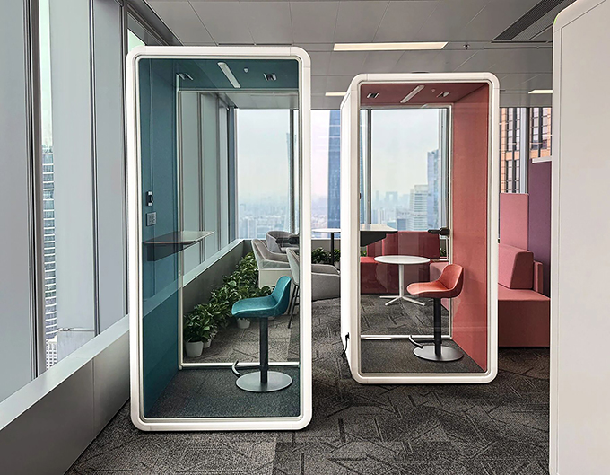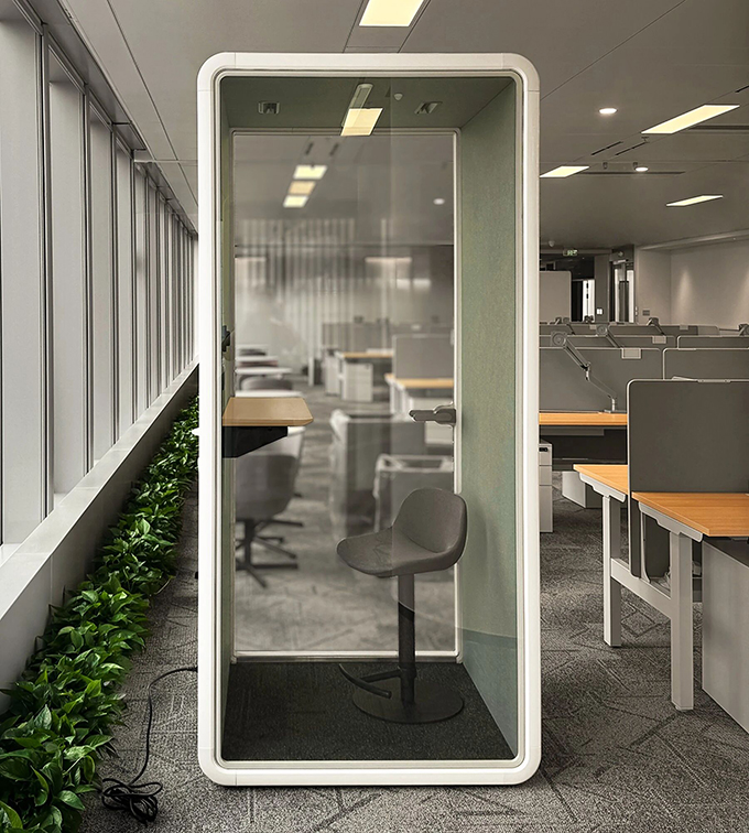 Located in the prime, high-cost core area of Guangzhou CBD, the company needed to comprehensively balance efficiency, agility, and functionality in space utilization. After extensive evaluation, they ultimately chose soundproof booth as the solution. The ease and flexibility of installation were key factors attracting the enterprise. Without the need for design, construction, or renovation costs, the company could quickly set up quiet spaces within the open office environment.