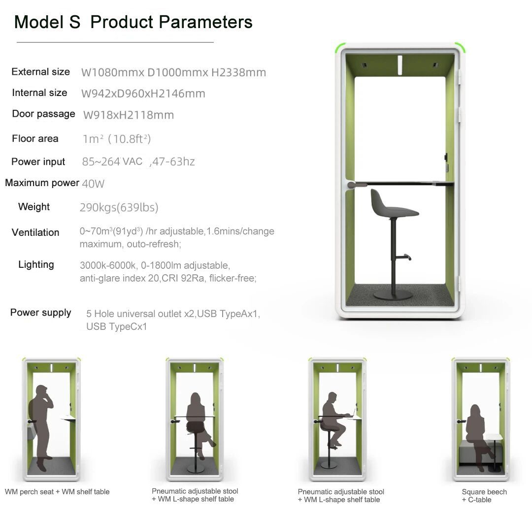 Model S is a multifunctional, compact workspace solution, perfect for solo work, phone calls, and meditation. With its 1m² footprint, it can easily be placed anywhere in the office, providing a private and quiet space for focused work or confidential conversations.