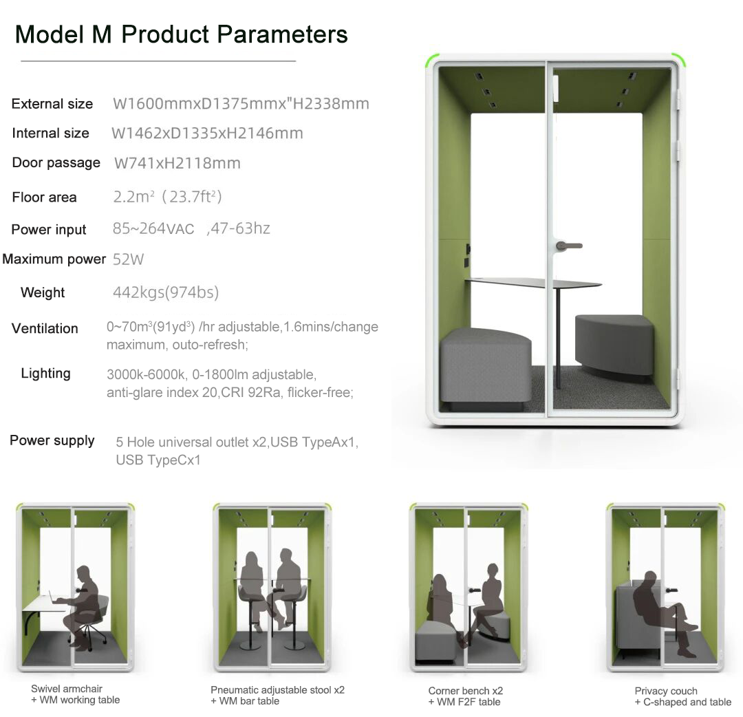 with its spacious 2.2m² area, offers a flexible and versatile space. Whether you need a personal workstation, a meeting room, or a quiet reading nook, the M pod provides the ideal environment for focused work, private meetings, or relaxation.