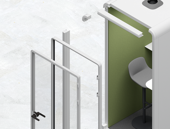 Model XL is a highly adaptable and spacious meeting room that comfortably accommodates up to six people. Strategically placed near workstations, it ensures fast, seamless communication between project teams. With customizable dimensions, the XL pod offers additional flexibility to meet the needs of large meetings or scenarios beyond the office setting.